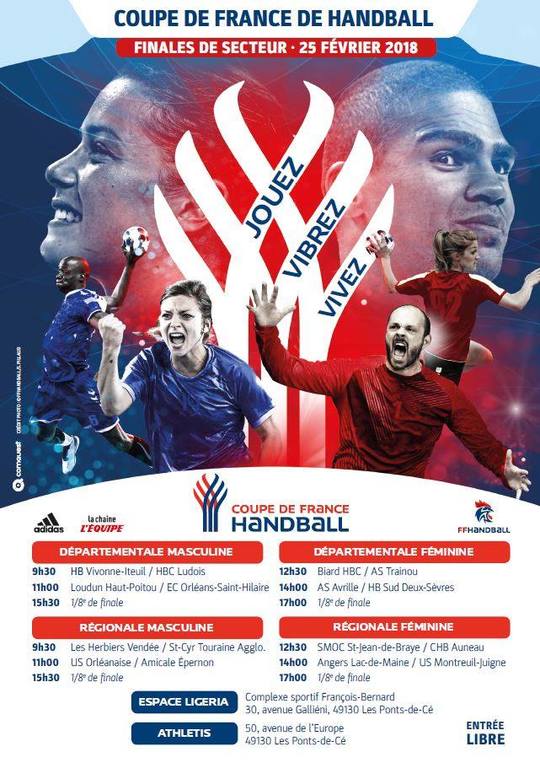 Pour ceux et celles qui souhaitent venir encourager notre Prénationale pour les 16èmes de finale de Coupe de France et un éventuel 8ème de finale. Le premier match aura lieu à 9h30 contre Les Herbiers Vendée Handball.